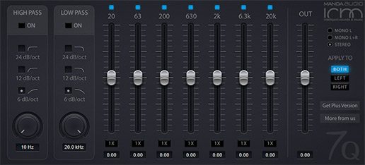 7Q is a simple, but effective graphical EQ with musically predefined bands and Q values. With the integrated high pass and low pass filters - especially with the high pass filter - you can tidy up your mix and make it more transparent. Use it either as your main EQ for an instrument or vocal track, or simply for a rough clean up before sending your signal further into a compressor. The low memory and CPU usage of the plugin allows to put it on every track of your project, if necessary.