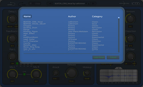New implementation of ducking in a delay without the need of sidechain routing via aux-bus. Together with Mondstein Records Intelligent Sounds & Music started to build a simple delay with Ducking. This feature allows you to add loud echos without losing the presence of the source signal. Use it e.g. to avoid an articulation loss. Then we found all the other useful features including the "rhythm preserving ping-pong" which obviously has never been realised before. Additional built in features are: Modulation, Saturation and Distortion, EQ, High pass and low pass filters, Undo/Redo and A/B comparsion.
